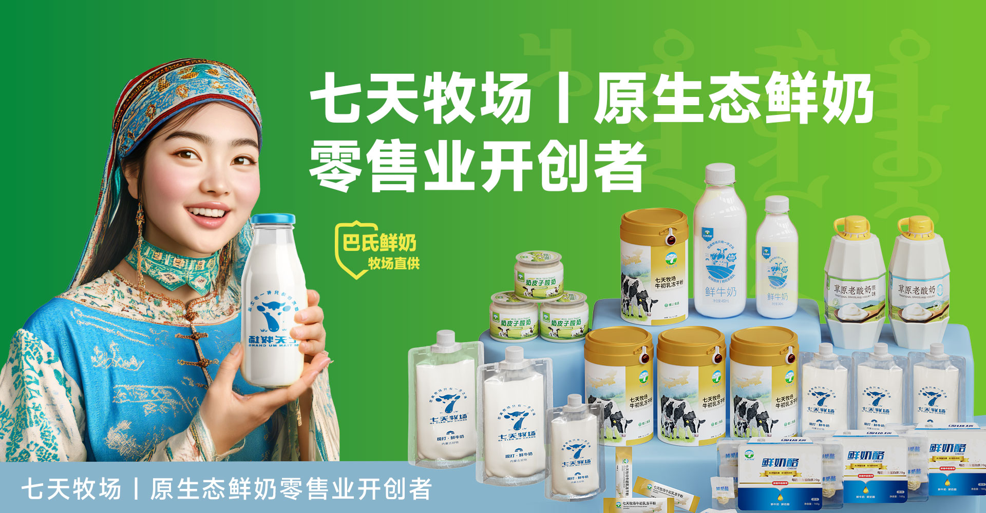 “七天牧场鲜奶吧”是北京一方山水科技集团旗下品牌之一。该品牌秉持着 “从心出发 ,致爱自然”的品牌理念,致力于为消费者提供健康、 有机、 绿色、 安全的产品。是一个集“现代农业+线下连锁零售+线上电商运营”为一体的综合型、标准化、全产业链运营品牌。品牌团队有着十数年线下食品连锁经营和互联网行业从业经验,主要经营巴氏鲜奶、创新乳制品、内蒙古、陕西特色食品以及来自全国核心产区的绿色有机食品、高端农副食品等。